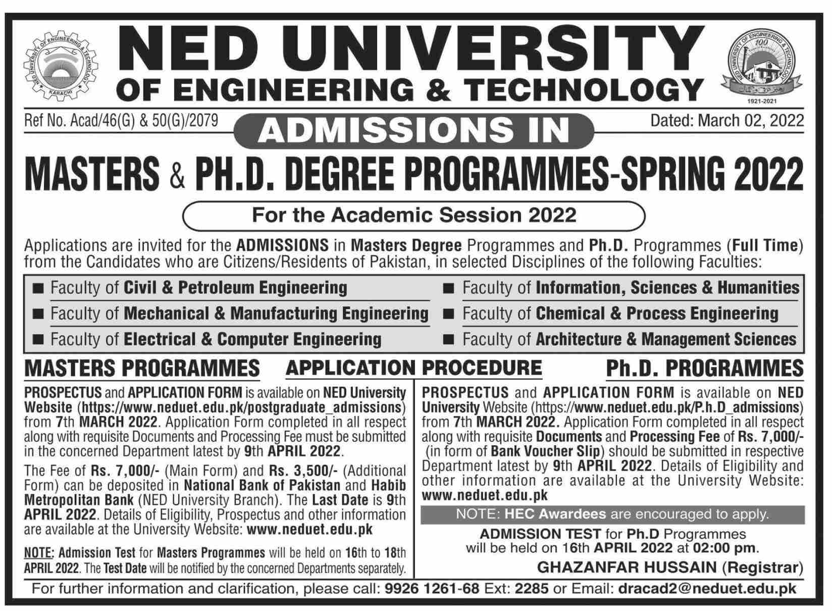 NED University of Engineering and Technology Faculty of Civil and Petroleum Engineering, Faculty of Mechanical and Manufacturing Engineering, Faculty of Electrical and Computer Engineering, Faculty of Information, Sciences and Humanities, Faculty of Chemical and Process Engineering, Faculty of Architecture and Management Sciences admissions 2022 has been announced. Students can enroll for admissions in NED University of Engineering and Technology Karachi Sindh Pakistan for academic year 2022 to continue campus based or online education in Science University. Students for admissions in Phd and Master & criteria can apply as per Government institute admission policy 2022 before closing date April 9, 2022 as per advertisement. Read newspaper ad for exact details.