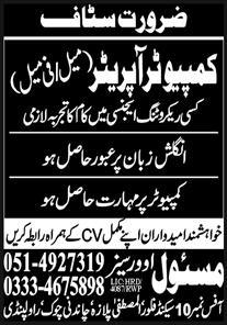 Maswol Overseas Employment Promoters Rawalpindi, rawalpindi Punjab Pakistan invites applications from eligible candidates for the post of female computer operator and computer operator as per advertisement of November 11, 2022 published in daily Express Newspaper. Candidates with Bachelor and Intermediate etc. educational background will be preferred.