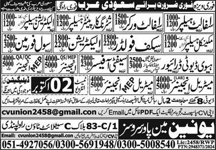 Union Manpower Services jobs advertisement dated about 1 October 2024 in daily Express Newspaper invites application for the vacant post of material mep engineer, mechanical helper, electrician, civil foreman, scaffolder, shuttering carpenter helper, asphalt helper, qs engineer, safety officer, qc engineer, asphalt worker, engineer, heavy duty driver, qa engineer, mep engineer, electrician helper and material engineer in Riyadh, dammam Saudi Arabia. Candidates with Matric, DAE, Intermediate, Bachelor and B.E etc. educational background will be preferred.