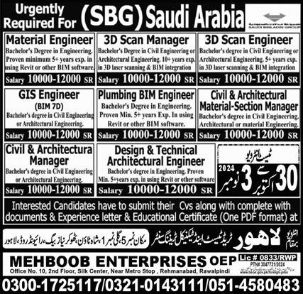 Mehboob Enterprises Overseas Employment Promoters jobs advertisement dated about 29 October 2024 in daily Express Newspaper invites application for the vacant post of Design Engineer, Engineer, Gis Engineer, 3d Scan Manager, Material Engineer, Technical Architectural Engineer, Civil Manager, 3d Scan Engineer, Civil Section Manager, Plumbing Bim Engineer, Architectural Material Section Manager and Architectural Manager in Saudi Arabia, saudi arabia Saudi Arabia. Persons with Intermediate, Bachelor, DAE and Matric etc. education can apply.