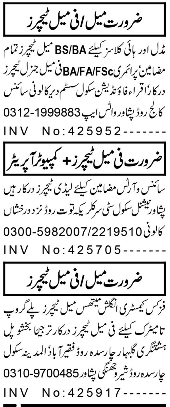 Private School invites applications for job positions advertised in daily Aaj dated 25 October 2023 for following vacancies in Peshawar, peshawar Khyber Pakhtunkhwa KPK Pakistan.