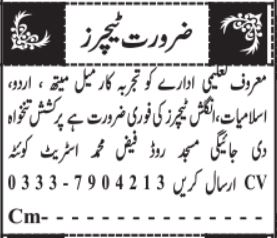 Private School invites applications for job positions advertised in daily Jang dated 28 February 2025 for following vacancies in Quetta, quetta Balochistan Pakistan.