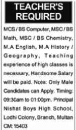 Nishat Boys High School is looking for candidates for following posts as per job advertisement published in daily Nawaiwaqt Newspaper of January 24, 2024 for location Multan, multan Punjab Pakistan: