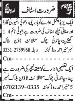 Educational Organization invites applications for job positions advertised in daily Jang dated 12 January 2024 for following vacancies in Quetta, quetta Balochistan Pakistan.