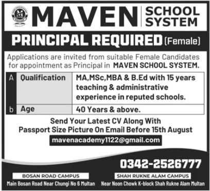 Maven School System Multan, multan Punjab Pakistan invites applications from eligible candidates for the post of principal as per advertisement of August 11, 2024 published in daily Jang Newspaper. B.ed, MBA, M.sc and MA etc. educational qualification will be preferred.