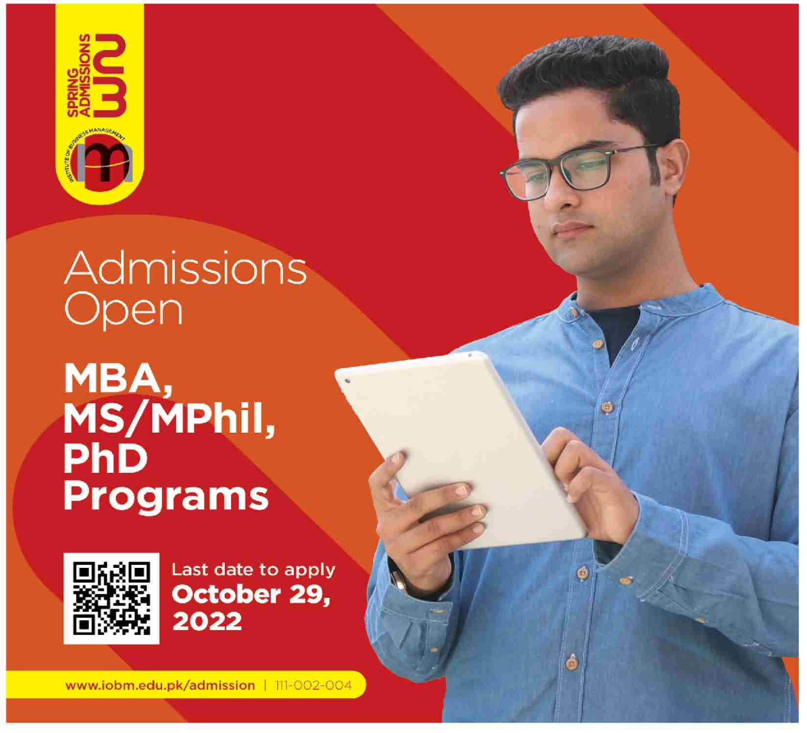 The Institute of Business Management IoBM admissions 2022 for MBA, MS, MPhil, PhD has been announced. Eligible students who qualify as per admission criteria in The Institute of Business Management IoBM Karachi Sindh Pakistan can apply in Management University for academic year 2022. Students who want to enroll for academic session 2022 in MBA, Mphil, Phd and MS qualification and admission criteria for Private institute can apply till last date 29 October 2022. Read newspaper ad for exact details.