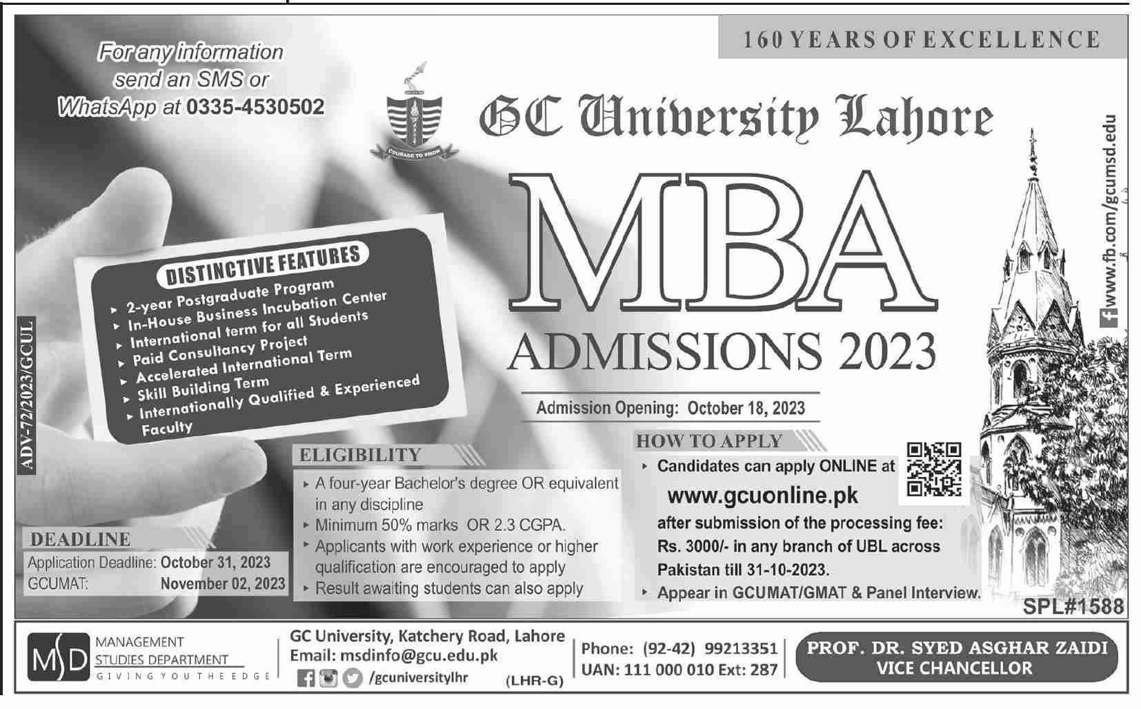 GC University has announced admissions 2023 for MBA Program. Students who want to take admissions in GC University Lahore Punjab Pakistan for academic year 2023 to continue education in Management University can apply. Students for admissions in MBA & criteria can apply as per Government institute admission policy 2023 before closing date October 31, 2023 as per advertisement. Read newspaper ad for exact details.
