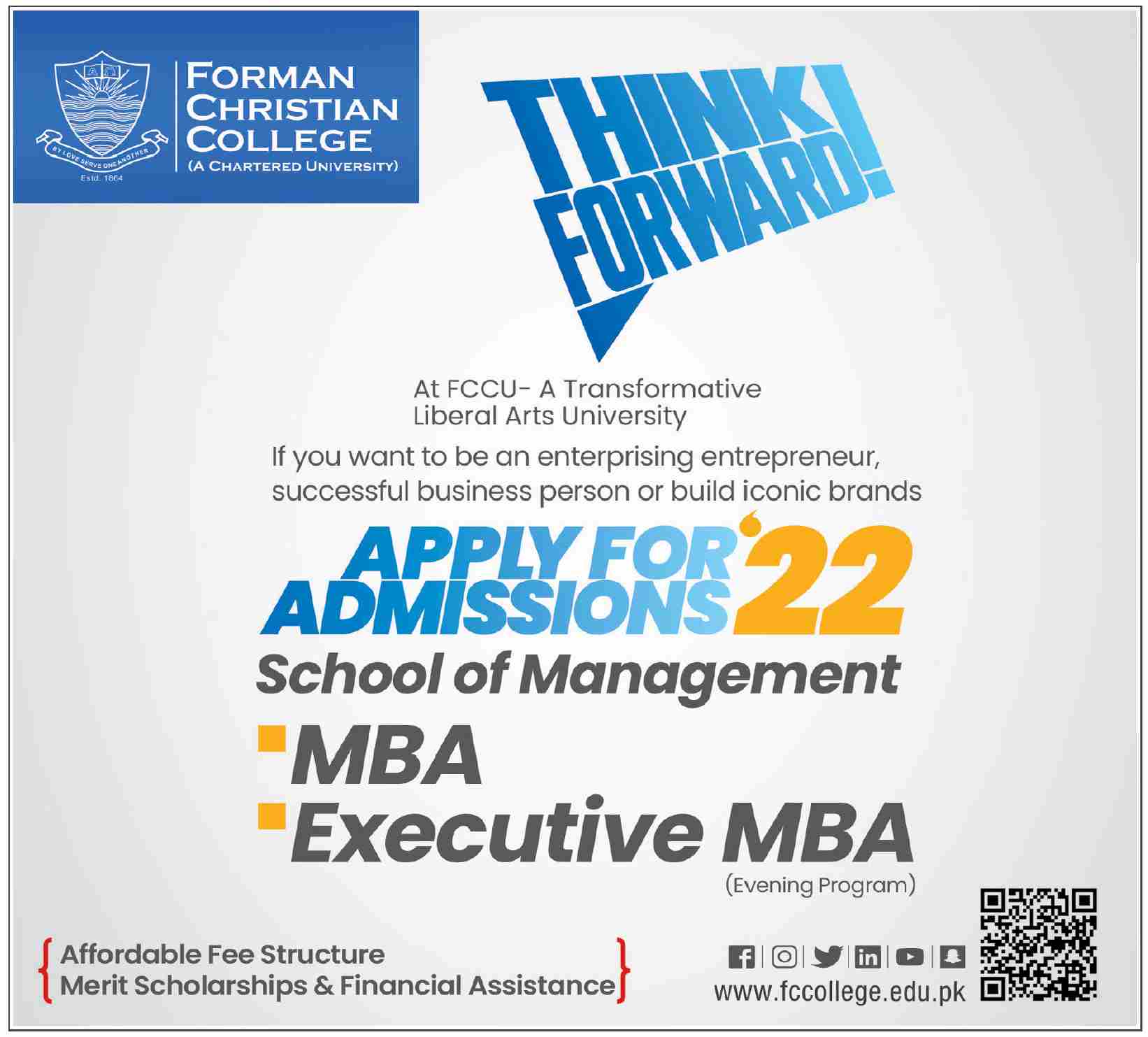 Forman Christian College has announced admissions 2022 for MBA, Executive MBA. Forman Christian College Lahore Punjab Pakistan welcomes students to apply for admissions in academic year 2022 in Management College. Students for admissions in MBA can apply for online or campus classes as per Private institute criteria till admission closing date August 1, 2022. Read newspaper ad for exact details.
