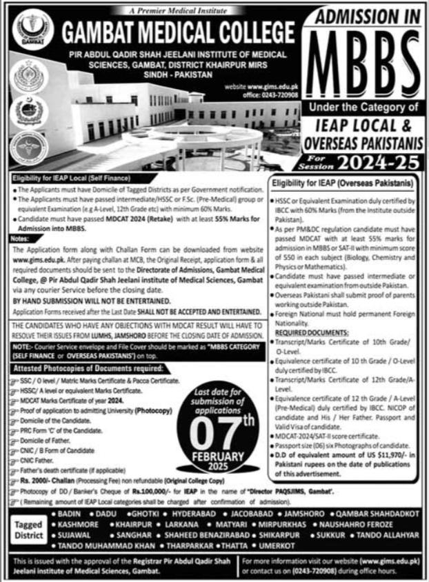 Admissions in Gambat Institute of Medical Sciences 2025 for mbbs has been announced. Eligible students who qualify as per admission criteria in Gambat Institute of Medical Sciences Tando Allahyar Taunsa Sharif Sindh Pakistan can apply in Medical College for academic year 2025. Students for admissions in & criteria can apply as per Government institute admission policy 2025 before closing date as per advertisement. Read newspaper ad for exact details.