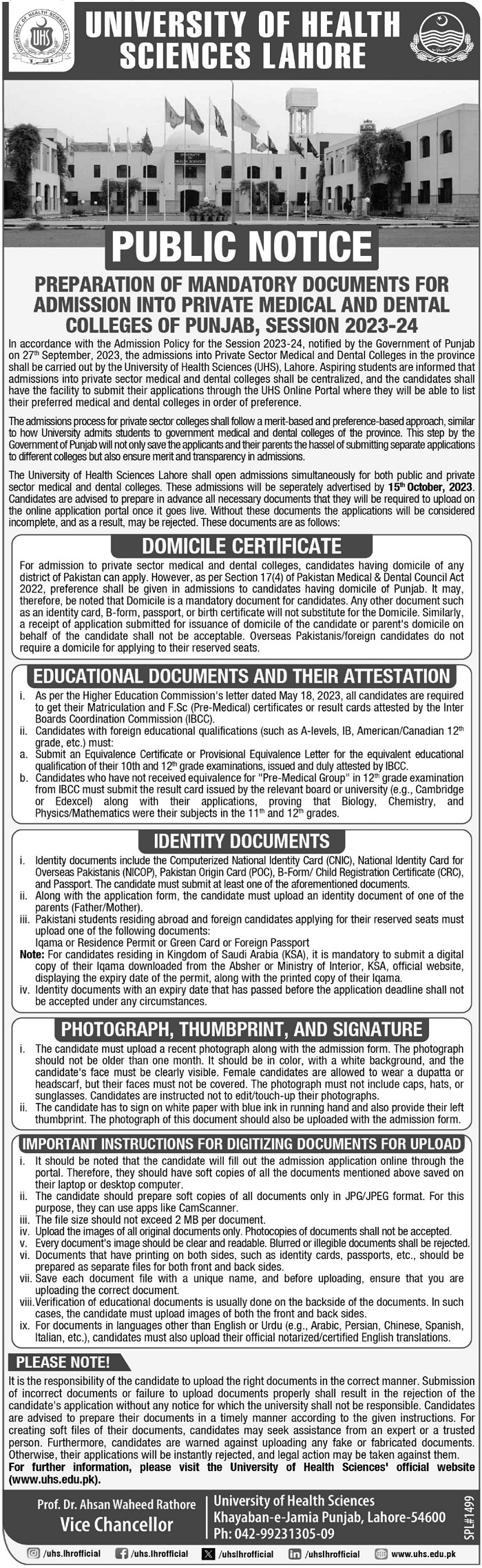 University of Health Sciences has announced admissions 2023 for MBBS, BDS. Students can enroll for admissions in University of Health Sciences Lahore Punjab Pakistan for academic year 2023 to continue campus based or online education in Medical University. Eligible candidates for admissions in BDS and MBBS can apply as per Government institute criteria and before closing date 23 October 2023 after reading advertisement online. Read newspaper ad for exact details.