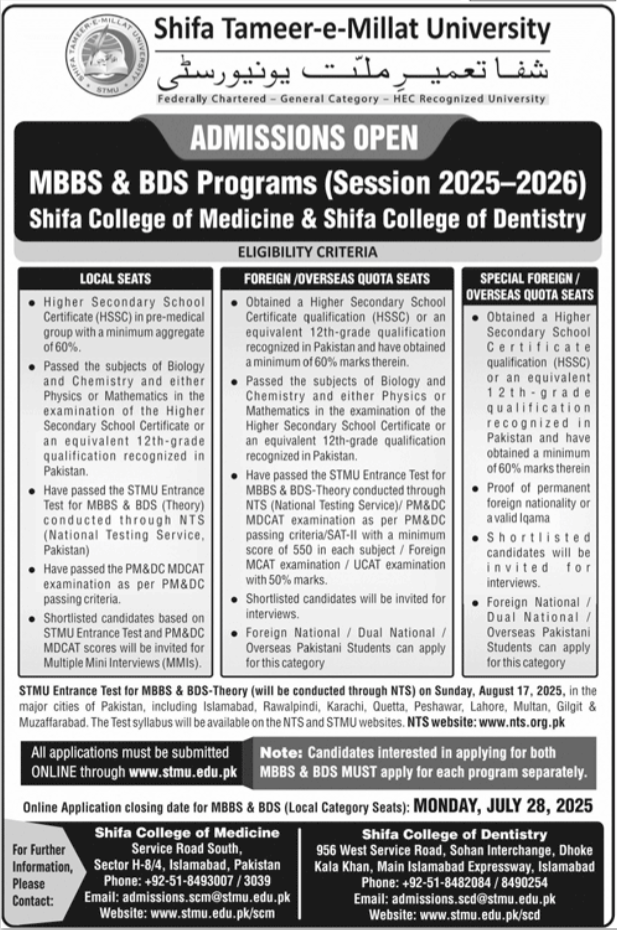 Shifa Tameer e Millat University STMU MBBS, BDS admissions 2025 has been announced. Eligible students can apply for academic admissions 2025 in Shifa Tameer e Millat University STMU Islamabad Islamabad Pakistan for Medical AIOU. Eligible students for fulfilling criteria for admissions in can enroll as per Government admission policy 2025 till closing date. Read newspaper ad for exact details.