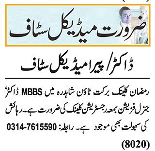 Private Clinic jobs advertisement dated about 4 December 2025 in daily Nawaiwaqt Newspaper invites application for the vacant post of mbbs doctor, general physician and doctor in Barkat Colony Lahore, lahore Punjab Pakistan. DPT and MBBS etc. educational qualification will be preferred.
