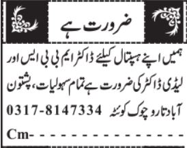 Hospital Clinic Quetta, quetta Balochistan Pakistan invites applications from eligible candidates for the post of mbbs doctor, doctor and lady doctor as per advertisement of March 11, 2025 published in daily Jang Newspaper. Educational qualifications required MBBS etc.