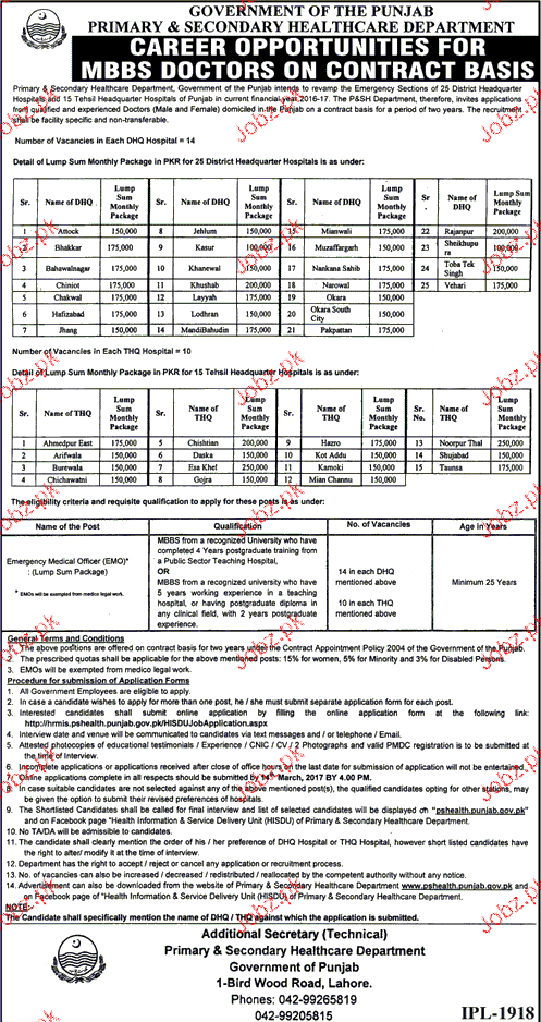 MBBS Doctors are required in Primary Health & Secondary Department in Lahore.