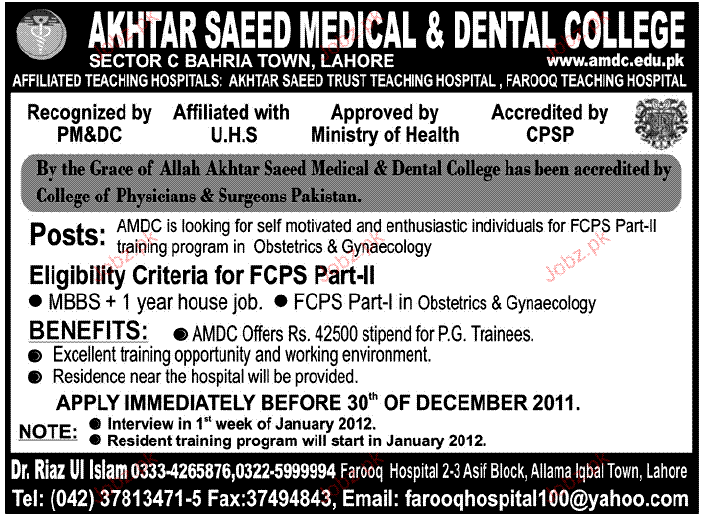 MBBS Doctors are required in Akhtar Saeed Medical & Dental College in Lahore