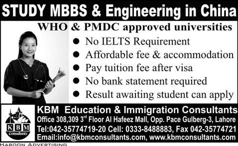 MBBS & Engineering in China Read newspaper ad for exact details.