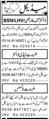 Vacant posts including nurse, doctor, gynecologist, lady doctor, mbbs lady doctor, doctor of pharmacy, pharmacist and lhv are announced in Hospital Clinic Peshawar, peshawar Khyber Pakhtunkhwa KPK Pakistan as per 12 August 2023 advertisement in daily Aaj Newspaper. Bachelor, Intermediate, Matric, B Pharmacy, MBBS and Pharma D etc. educational qualification will be preferred.