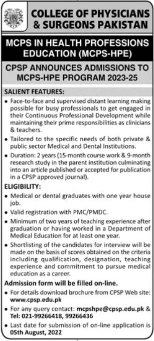 Latest Government jobs in College of Physician and Surgeons Pakistan CPSP in Medical and others can be applied till 5 August 2022 or as per closing date in newspaper ad. Read complete ad online to know how to apply on latest College of Physician and Surgeons Pakistan CPSP job opportunities.