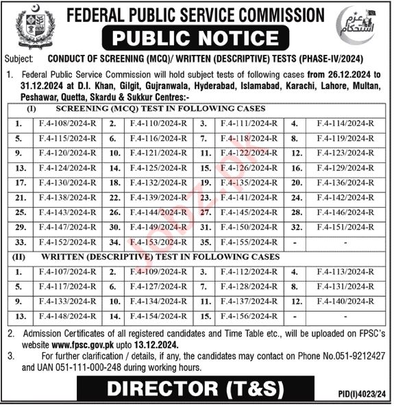 Federal Public Service Commission FPSC jobs advertisement dated about 15 December 2024 in daily Nawaiwaqt Newspaper invites application for the vacant post of written test and mcq test in Islamabad, islamabad Islamabad Pakistan. Preferred Education is Bachelor and Master etc.