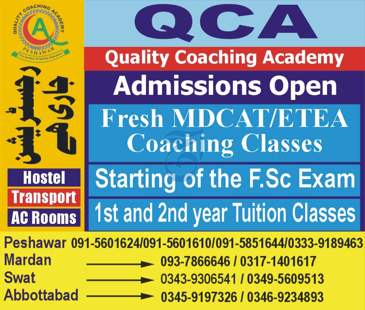Quality Coaching Academy QCA admissions 2024 for MDCAT, ETEA has been announced. Eligible students can apply for academic admissions 2024 in Quality Coaching Academy QCA Peshawar Khyber Pakhtunkhwa KPK Pakistan for Science College. Eligible students for fulfilling criteria for admissions in Intermediate can enroll as per Private admission policy 2024 till closing date 17 June 2024. Read newspaper ad for exact details.