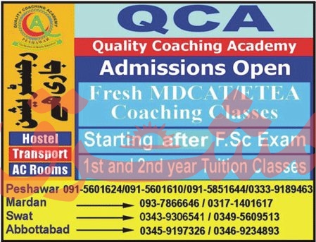 Quality Coaching Academy QCA MDCAT, ETEA admissions 2024 has been started. Eligible students can apply for academic admissions 2024 in Quality Coaching Academy QCA Peshawar Mardan, Swat, Abbottabad and Khyber Pakhtunkhwa KPK Pakistan for Science College. Students who want to enroll for academic session 2024 in Course qualification and admission criteria for Private institute can apply till last date 24 June 2024. Read newspaper ad for exact details.