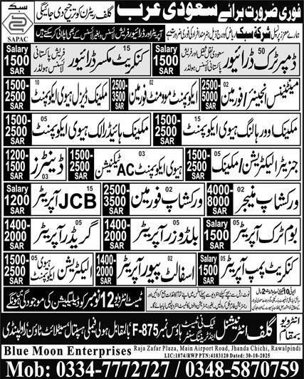 Vacant posts including concrete pump operator, mechanic overhauling heavy equipment, electrician heavy equipment, generator electrician, mechanic diesel heavy equipment, workshop foreman, concrete mixer driver, asphalt paver operator, equipment movement foreman, mechanic hydraulic heavy equipment, generator mechanic, workshop manager, denter, grader operator, maintenance foreman, bulldozer operator, dumper truck driver, heavy equipment ac technician, maintenance engineer, jcb operator and boom truck operator are announced in Blue Moon Enterprises Riyadh, jeddah Saudi Arabia as per 11 November 2025 advertisement in daily Express Newspaper. Persons with B.E, Matric, Intermediate, DAE and Bachelor etc. education can apply.