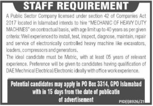 Vacant posts including mechanic of heavy duty machine are announced in Public Sector Company Islamabad, islamabad Islamabad Pakistan as per 22 June 2022 advertisement in daily The News Newspaper. Persons with Matric etc. education can apply.