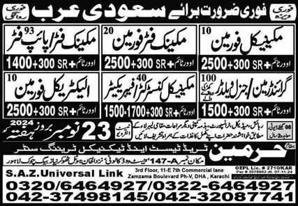 Vacant posts including mechanic fitter, electrical foreman, mechanical fabricator, mechanic fitter foreman, pipe fitter, mechanical constructor, mechanical foreman, general welder and grinder man are announced in SAZ Universal Link Riyadh, riyadh Saudi Arabia as per 20 November 2024 advertisement in daily Express Newspaper. Educational qualifications required Matric, Intermediate and Middle etc.