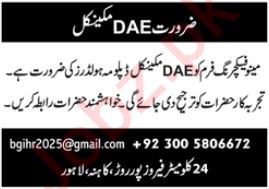 Vacant posts including mechanical diploma holder and sub engineer are announced in Private Company Manufacturing Lahore, lahore Punjab Pakistan as per 12 May 2024 advertisement in daily Jang Newspaper. Preferred Education is DAE etc.