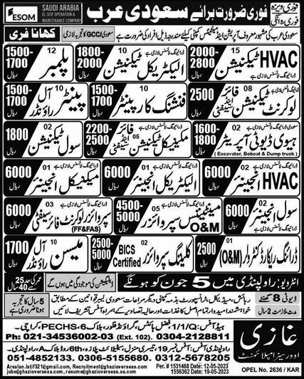 Ghazi Overseas Employment Riyadh, dammam Saudi Arabia invites applications from eligible candidates for the post of mason, mechanical technician, electrical technician, cleaning supervisor, low current technician, civil technician, hvac engineer, fire technician, heavy duty operator, electrical engineer, finishing carpenter, plumber, safety technician, supervisor low current, hvac technician, mechanical engineer, painter, civil engineer, drawing record controller and maintenance supervisor as per advertisement of June 3, 2023 published in daily Express Newspaper. Matric, DAE, Bachelor, BA, Intermediate and B.E etc. educational qualification will be preferred.