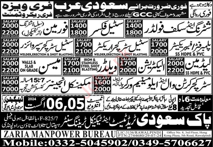 Pak Saudi Trade Test & Technical Training Center Jeddah, jeddah Saudi Arabia invites applications from eligible candidates for the post of fabricator, foreman, mechanical engineer, electrician, steel fixer, welder, plumber, shuttering skiff folder and mason as per advertisement of August 4, 2024 published in daily Express Newspaper. Preferred Education is Matric, DAE, Primary, B.E and Middle etc.