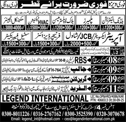 Legend International Recruitment Agency Doha, doha Qatar invites applications from eligible candidates for the post of building electrician, mechanical engineer, block mason, plaster mason, jcb operator, furniture designer, plumber, steel fabricator, excavator operator, hvac technician and shawl operator as per advertisement of December 5, 2025 published in daily Express Newspaper. Matric, B.E, Bachelor, DAE and Intermediate etc. educational qualification will be preferred.
