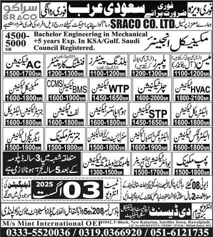 Vacant posts including welding technician, mechanical engineer, generator mechanic, boiler operator, ac technician, central network technician, finishing carpenter, building painter, plumber, generator technician electrical, electronics technician, plumbing technician, agricultural technician, pump mechanic, ccms technician, wtp technician, stp technician, electronics control technician, bms technician, hvac technician, chiller technician, mason, lift technician, mechanical technician, boiler technician, home appliances technician, telephone technician and electrical technician are announced in The Descent Trade Test Center Riyadh, dammam Saudi Arabia as per 26 July 2025 advertisement in daily Express Newspaper. Candidates with Matric, Bachelor, DAE, Others, B.E and Intermediate etc. educational background will be preferred.