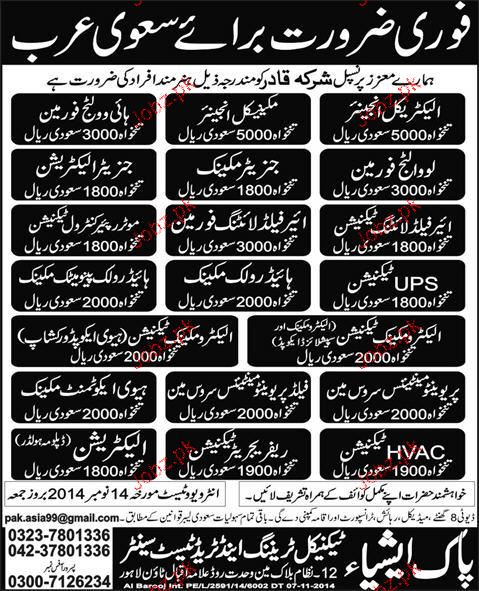 Mechanical Engineers, Electrical Engineers, Technicians, Generator Electricians, UPS Technicians, Hyraulic Mechanics and HVAC Technicians are required in Saudi Arabia.