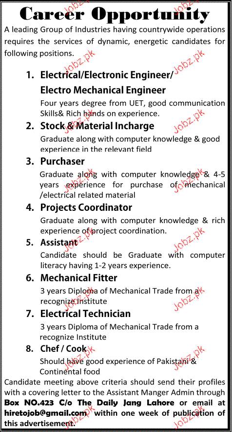 Mechanical Engineers, Electrical Engineers, Stock & material Incharge and Purchasers are required in Lahore