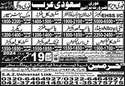 Vacant posts including mechanical fabricator, work permit receiver, millwright technician, pipe fabricator, shutdown project coordinator, rigger, ehss engineer, mechanical technician, tank fabricator, multi alloy welder and pipe fitter are announced in SAZ Universal Link Saudi Arabia, saudi arabia Saudi Arabia as per 9 September 2024 advertisement in daily Express Newspaper. Educational qualifications required DAE, Matric, Bachelor and Intermediate etc.