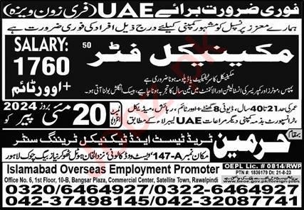 Harmain Trade Test & Technical Training Center jobs advertisement dated about 19 May 2024 in daily Express Newspaper invites application for the vacant post of mechanical fitter in UAE, dubai UAE. Persons with Middle and Matric etc. education can apply.