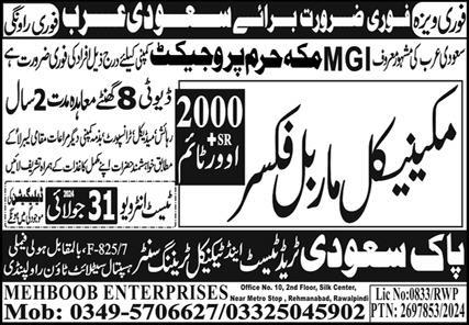 Pak Saudi Trade Test & Technical Training Center jobs advertisement dated about 25 July 2024 in daily Express Newspaper invites application for the vacant post of mechanical marble fixer in Madina, makkah Saudi Arabia. Intermediate and Matric etc. educational qualification will be preferred.