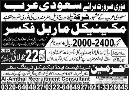 Vacant posts including mechanical marble fixer are announced in Al Amthal Recruitment Consultant Riyadh, riyadh Saudi Arabia as per 17 July 2023 advertisement in daily Express Newspaper. Preferred Education is Middle etc.