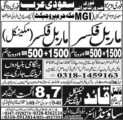 Vacant posts including mechanical marble fixer and marble fixer are announced in Quaid Technical Training Center Makkah, jeddah Saudi Arabia as per 31 July 2025 advertisement in daily Express Newspaper. Candidates with Others, Intermediate, Matric and DAE etc. educational background will be preferred.