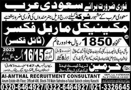 Harmain Trade Test & Technical Training Center jobs advertisement dated about 9 August 2023 in daily Express Newspaper invites application for the vacant post of mechanical marble fixer and tile fixer in Madina, jeddah Saudi Arabia. Persons with Intermediate and Matric etc. education can apply.
