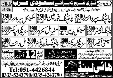 High Land International jobs advertisement dated about 12 October 2024 in daily Express Newspaper invites application for the vacant post of piping foreman, structure erector, millwright technician, safety officer, structure fabricator, piping fabricator, mechanical supervisor, piping engineer, material controller, mechanical foreman and piping supervisor in Jeddah, riyadh Saudi Arabia. Preferred Education is Bachelor, DAE, B.E, Matric and Intermediate etc.