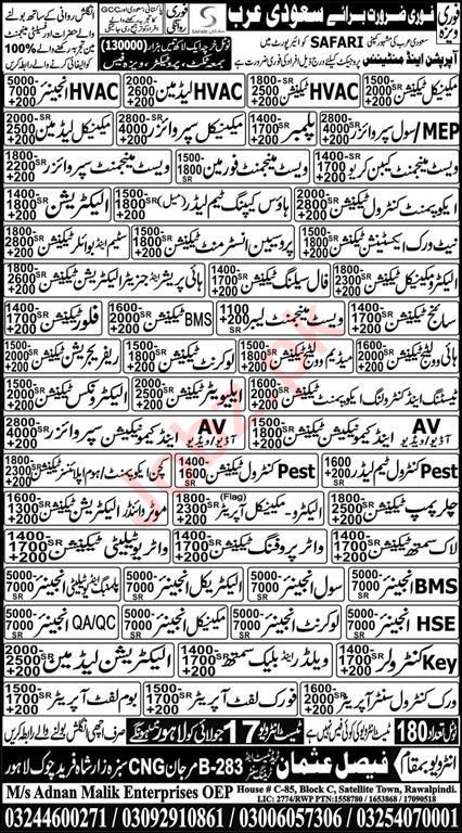 MS Adnan Malik Enterprises OEP Riyadh, riyadh Saudi Arabia invites applications from eligible candidates for the post of signage technician, electrician leadman, av communication supervisor, qc engineer, hvac engineer, av communication technician, medium voltage technician, instrument technician, low current engineer, steam boiler technician, fork lift operator, electro mechanical operator, welder blacksmith, home appliances technician, testing control equipment technician, mechanical technician, plumbing utility engineer, equipment control technician, high voltage technician, electronics technician, motor winder electrician technician, pest control technician, waste management labor, refrigeration technician, civil engineer, waste management supervisor, qa engineer, pest control team leader, bms engineer, mep supervisor, boom lift operator, water utility technician, network extension technician, work control center operator, locksmith technician, hse engineer, high pressure generator electrician technician, chiller pump technician, house keeping team leader, plumber, fall ceiling technician, low current technician, elevator technician, civil supervisor, kitchen equipment technician, mechanical supervisor, floor technician, electrician, mechanical lead man, waste management foreman, hvac technician, bms technician, key controller, electro mechanical technician, mechanical engineer, water proofing technician, electrical engineer and waste management cabin crew as per advertisement of July 16, 2023 published in daily Express Newspaper. B.E, Bachelor, Master and Intermediate etc. educational qualification will be preferred.