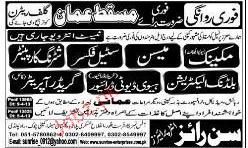 Mechanics, Mason, Steel Fixers, Shuttering Carpenters, Building Electricians, Heavy Duty Drivers and Grader Operators are required in Oman