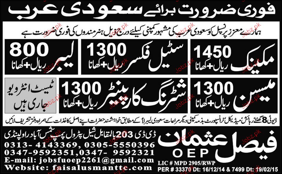 Mechanics, Steel Fixers, Labors, Mason Job Opportunity