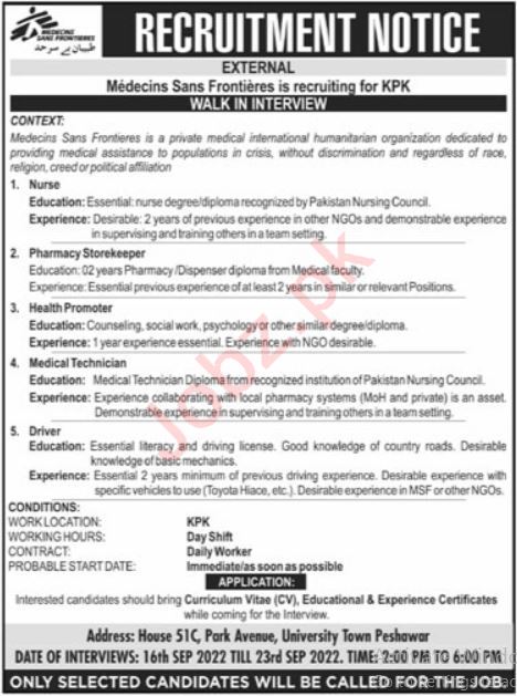 Medecins Sans Frontieres MSF invites applications for job positions advertised in daily Mashriq dated 18 September 2022 for following vacancies in Peshawar, peshawar Khyber Pakhtunkhwa KPK Pakistan.