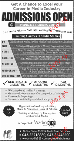 Media and Production House of Pakistan Media 313 Training Center Admission in Diploma Six Mots, PGD 12 Months and Certificates Three Months in Lahore. Read newspaper ad for exact details.