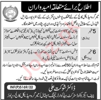Medical College Lower Dir, lower dir Khyber Pakhtunkhwa KPK Pakistan invites applications from eligible candidates for the post of store keeper, computer operator, office superintendant, telephone operator, clerk, generator operator, radio grapher, lab technician, office assistant, it assistant, sub engineer civil, assistant mortician, house keeper, sub engineer, projectionist, modeler artist, care taker, electromedical technician and ac technician as per advertisement of September 4, 2022 published in daily Aaj Newspaper. Preferred Education is MBBS etc.