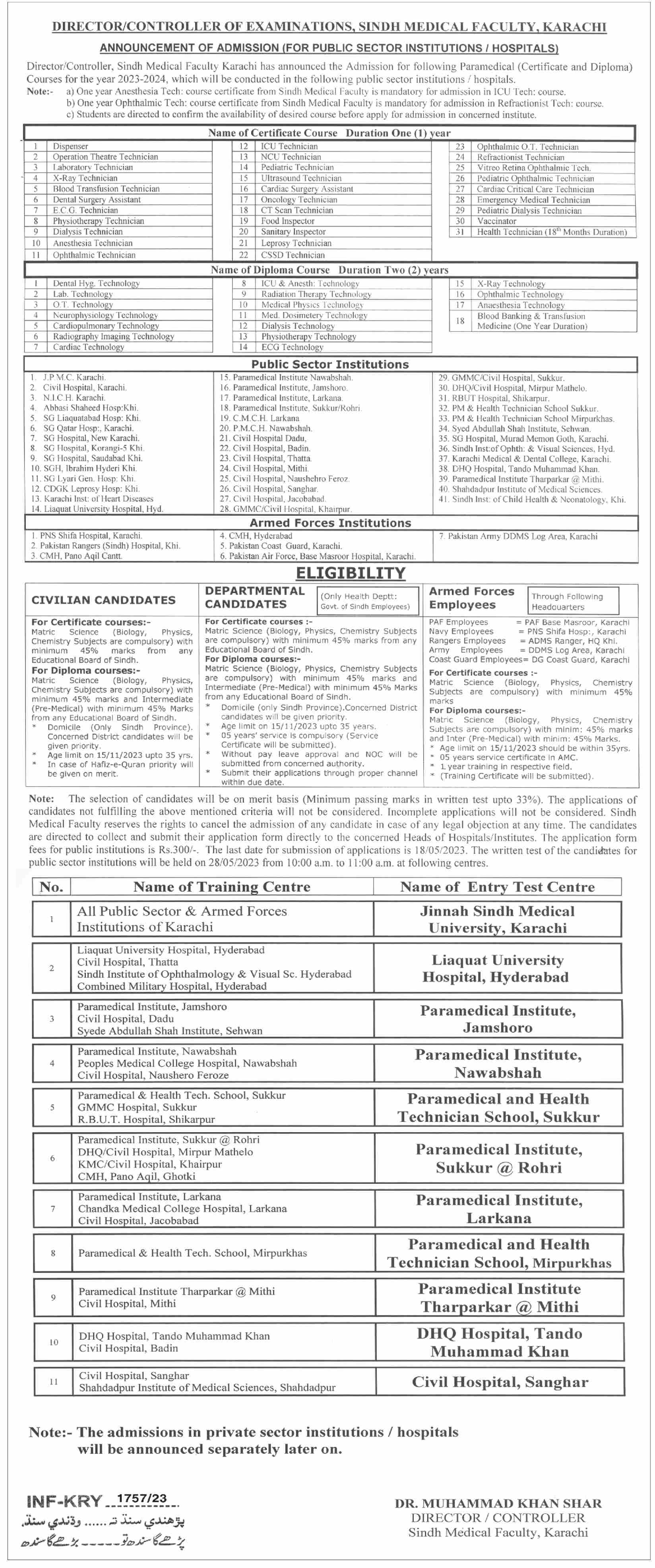 Public Sector Institute Dispenser, Operation Theatre Technician, Laboratory Technician, XRay Technician, Blood Transfusion Technician, Dental Surgery Assistant, ECG Technician, Physiotherapy Technician, Dialysis Technician, Anesthesia Technician, Ophthalmic Technician, ICU Technician, NCU Technician, Pediatric Technician admissions 2023 has been started. Eligible students who qualify as per admission criteria in Public Sector Institute Karachi Rohri, Tando Muhammad Khan, Naushahro Feroze, Nawabshah, Hyderabad, Mirpur Khas, Larkana, Mithi, Thatta, Sukkur, Mirpur Mathelo, Jamshoro, Shikarpur, Jacobabad, Dadu, Badin, , Sanghar and Khairpur Sindh Pakistan can apply in Medical Diploma for academic year 2023. Eligible students for fulfilling criteria for admissions in Diploma and Course can enroll as per Government admission policy 2023 till closing date 18 May 2023. Read newspaper ad for exact details.