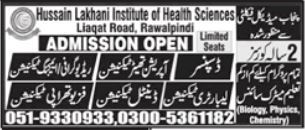 Hussain Lakhani Institute of Health Sciences Dispenser, Operation Theatre Technician, Radiography and Imaging Technician, Laboratory Technician, Dental Technician, Physiotherapy Technician admissions 2023 has been announced. Students who want to take admissions in Hussain Lakhani Institute of Health Sciences Rawalpindi Punjab Pakistan for academic year 2023 to continue education in Medical College can apply. Students for admissions in Diploma & criteria can apply as per Private institute admission policy 2023 before closing date March 26, 2023 as per advertisement. Read newspaper ad for exact details.